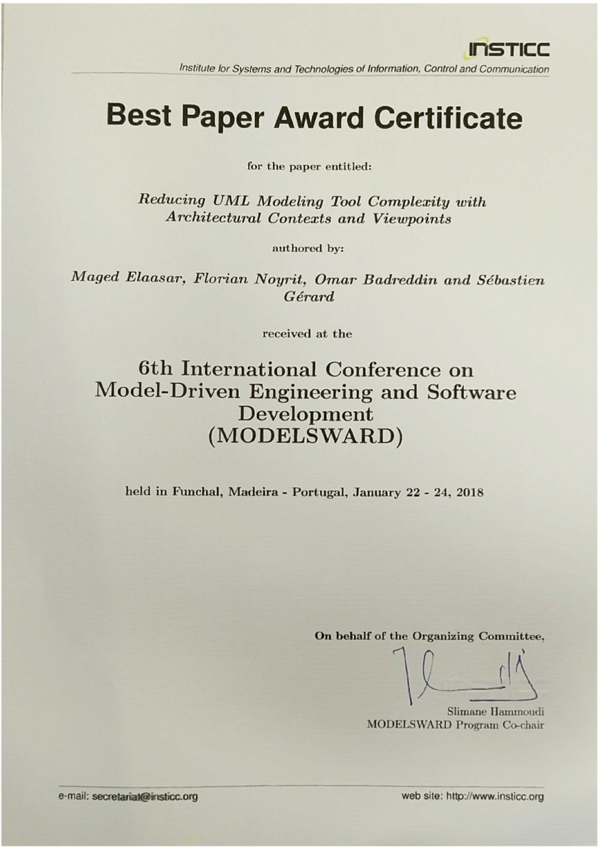 - Maged Elaasar, Florian Noyrit, Omar Badreddin, Sébastien Gérard. “Reducing UML Modeling Tool Complexity with Architectural Contexts and Viewpoints“. International Conference on Model-Driven Engineering and Software Development (MODELSWARD) 2017. Best Technical Paper Award. Selection process and prize.